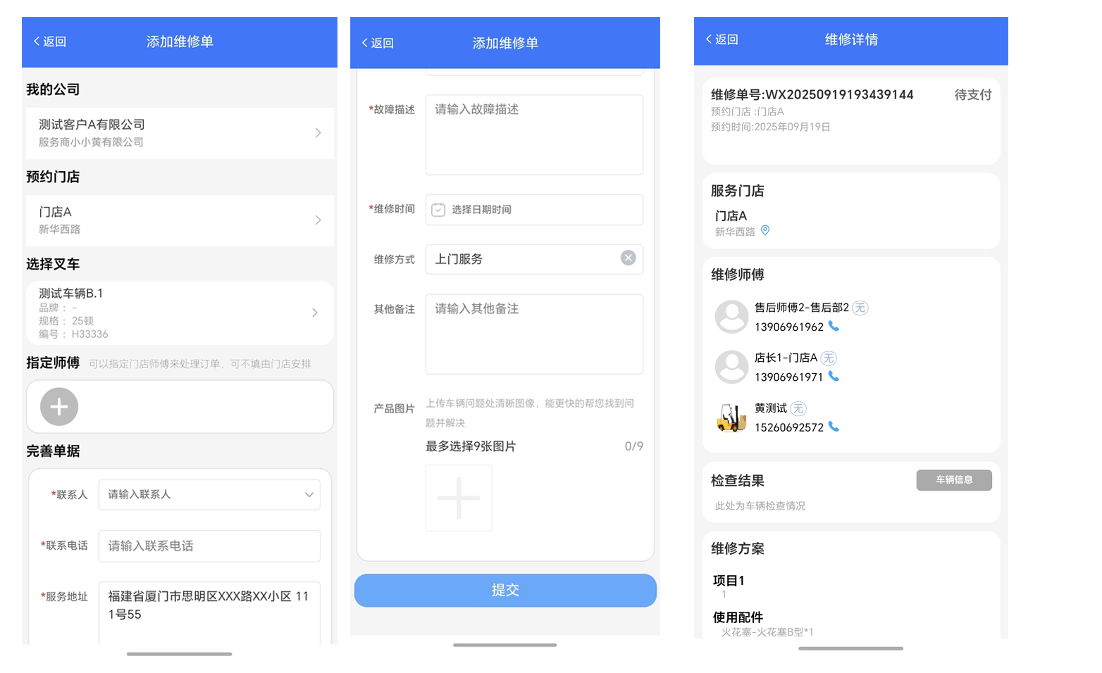 提交后,由叉車門店為用戶分配維修師傅。用戶可在APP里面,查詢自己的維修訂單。